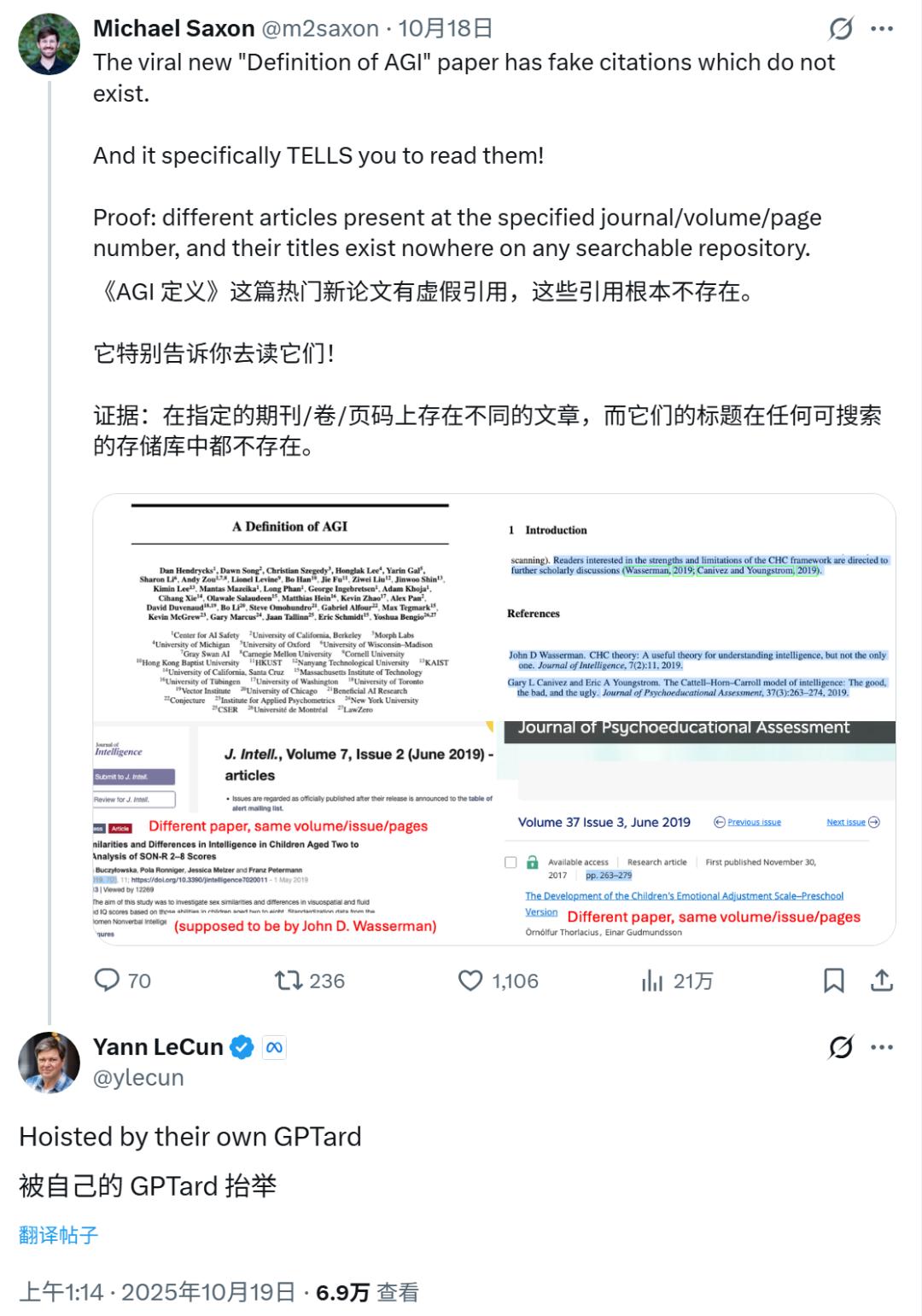 搞笑的是,就在同一天,Lecun 在一篇指出最近的热门论文《Definition of AGI》中存在虚假引用的帖子下面回复了相同的一句话。
