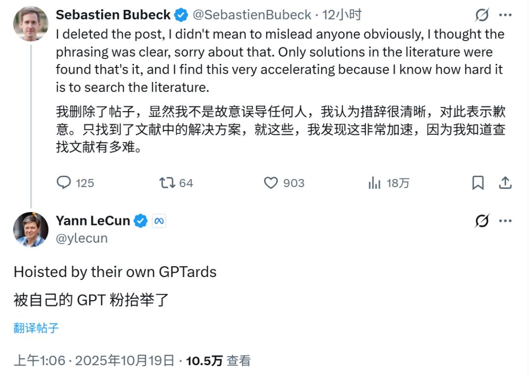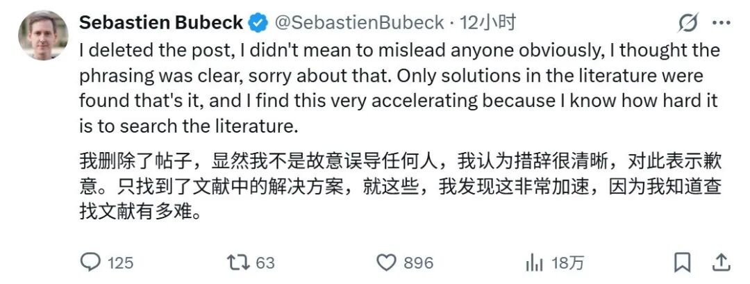 Sebastien Bubeck 随后删除帖子并道歉,称「我无意误导任何人,我认为表述很清楚,对不起」。他强调,AI 在文献搜索上的作用非常有价值,因为「搜索文献有多难,我很清楚」,这能加速科学研究。
