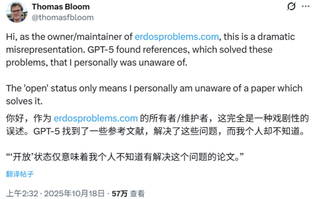 Thomas Bloom 表示:OpenAI 的表述为「戏剧性的误解」。网站上将这些问题标记为「未解决」,仅仅代表他个人不知道相关解答已经发表,并不意味着数学界没有人解决。