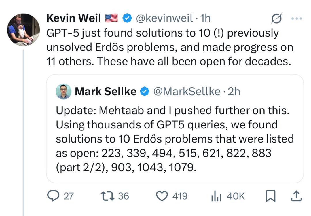 一句话概括就是:OpenAI 研究员宣称 GPT-5 「发现」了 10 个悬赏数学难题的解决方法,舆论误以为是 GPT-5 给出了解题方法,结果被发现只是检索到了早已存在的文献,引发了学界大佬的群嘲和对于 AI 夸大宣传的激烈讨论。