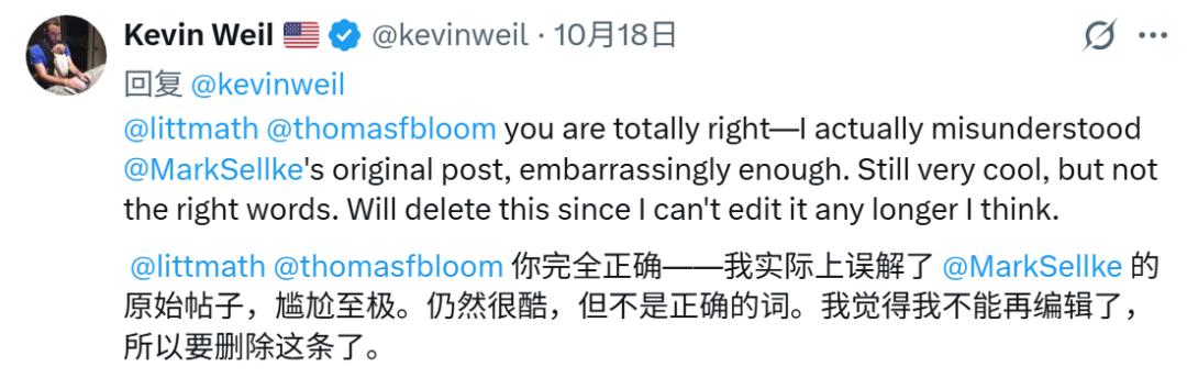 Kevin Weil 也删帖并承认「我实际上误解了我们的结果(尴尬)」。Mark Sellke 的更新也是转发此贴。