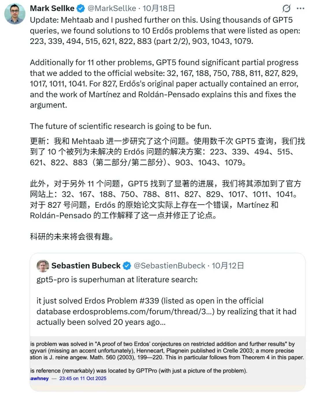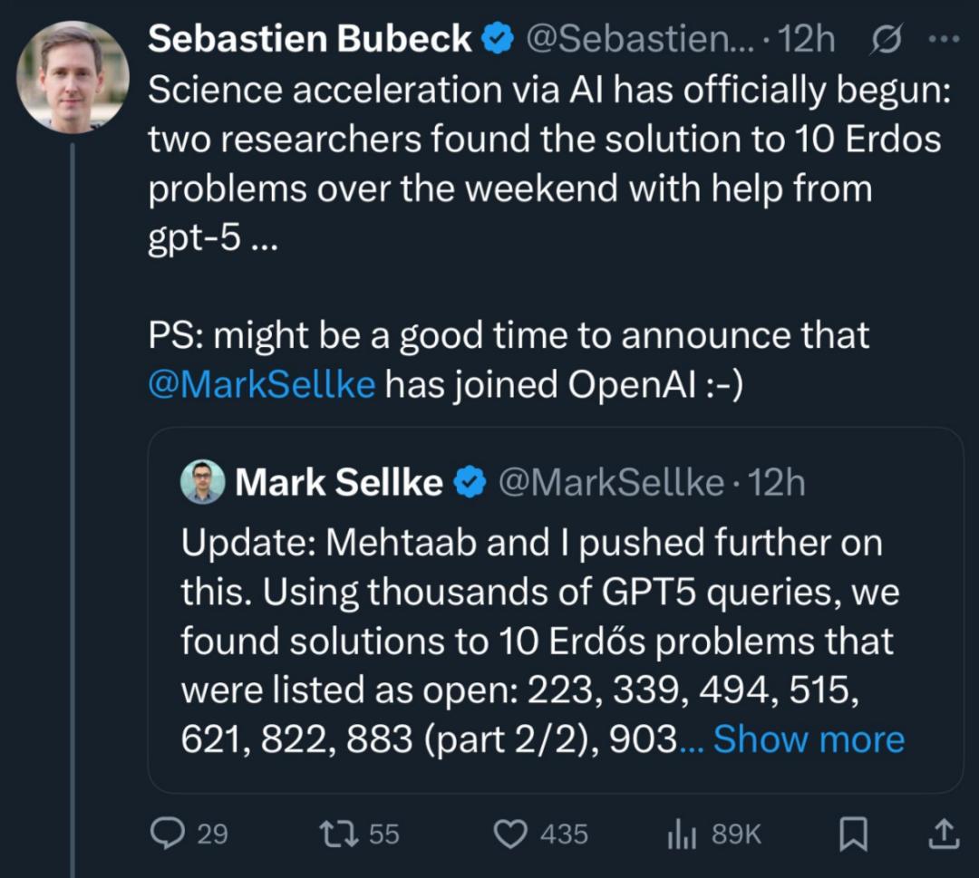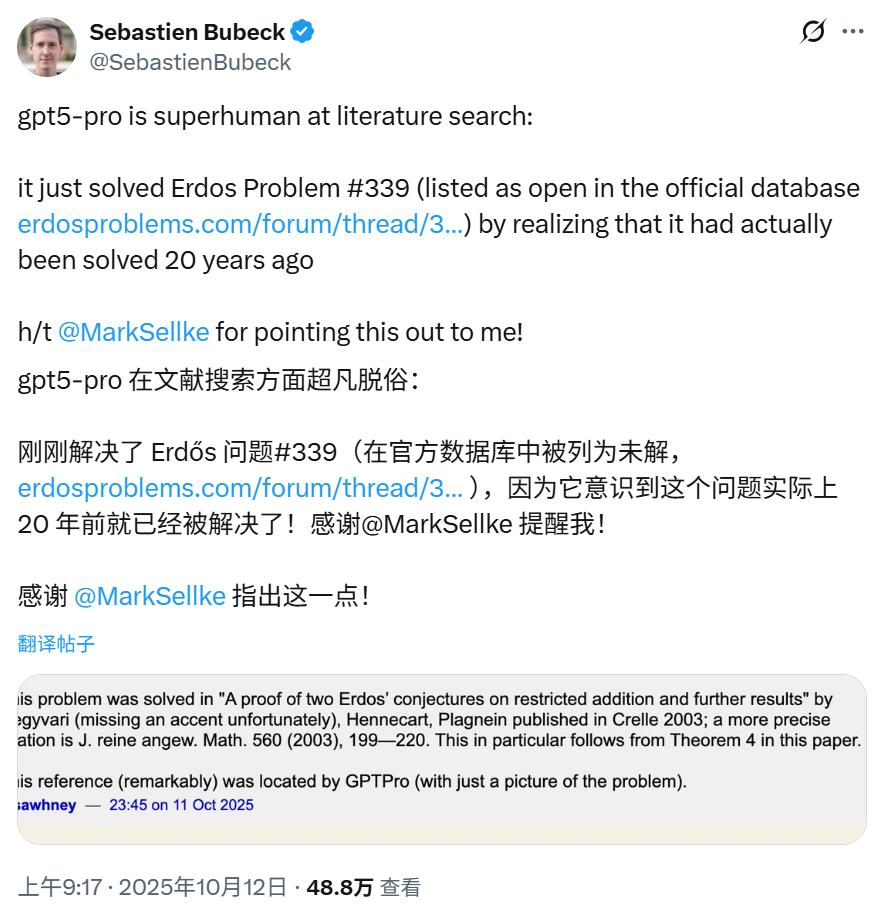 10 月 12 日,Sebastien Bubeck 发推表示 GPT-5 文献搜索方面超凡脱俗,发现了 Erdős 问题 339 已被解决但在官方数据库中状态尚未修改。