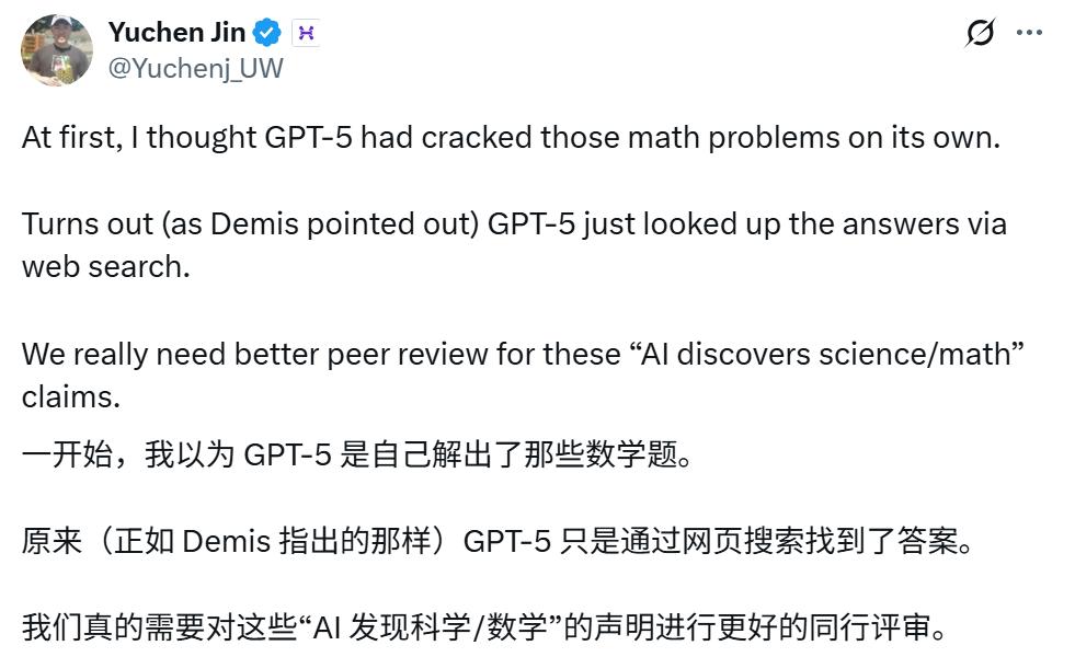 一时间,公众和媒体普遍认为 GPT-5 在数学推理能力上取得了惊人突破,能够独立解决困扰人类数学家数十年的难题。