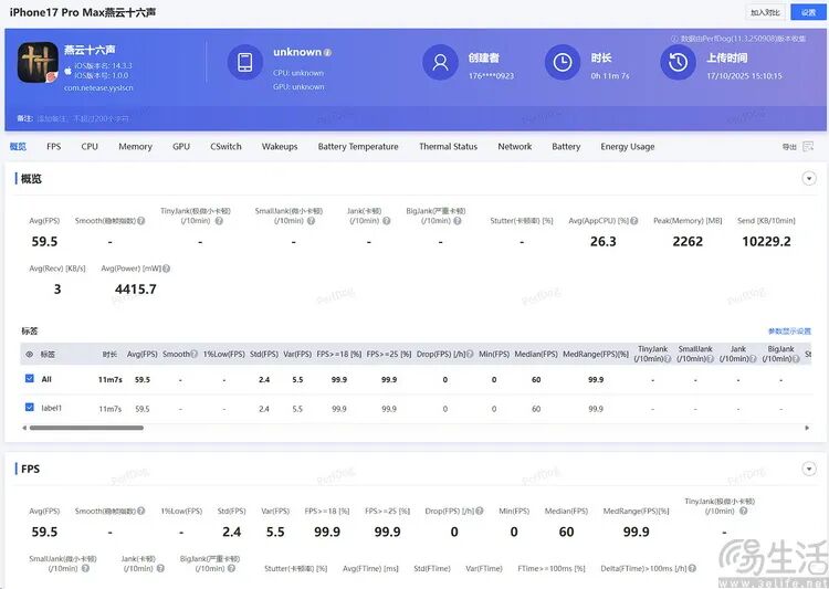 不过如果是与iPhone 17 Pro Max对比,就会变得非常有趣了。首先在《王者荣耀》里,iPhone 17 Pro Max是有120FPS模式的,只不过目前版本的测试软件还无法显示(仅能显示为60FPS)。但这不重要,重要的是iPhone 17 Pro Max在游戏帧率高了一倍的情况下,平均功耗反而要比iPhone 17低了不少。