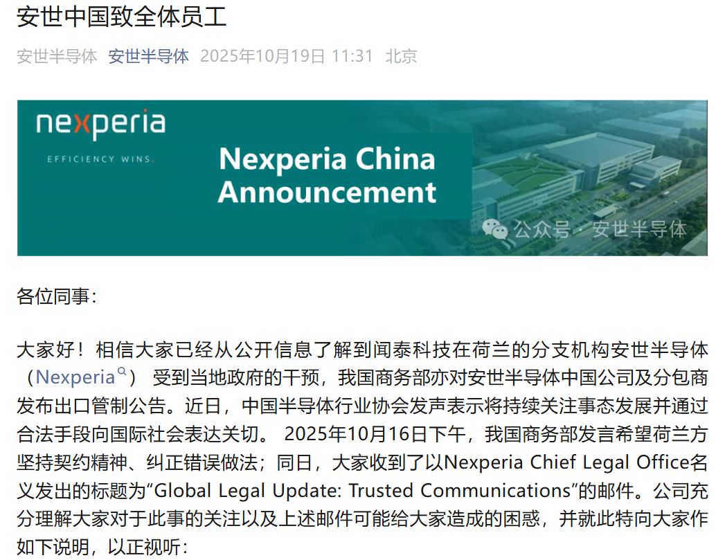 10月19日,安世半导体中国官微发布《安世中国致全体员工》的公开信,对近期情况进行说明。