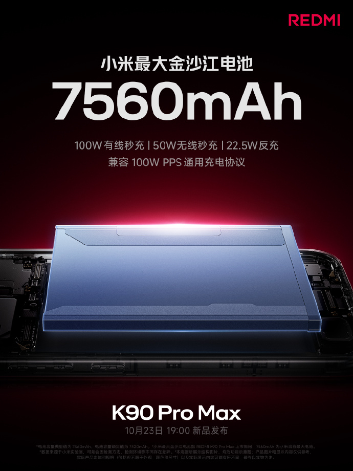 IT之家 10 月 20 日消息,小米刚刚宣布,REDMI K90 Pro Max 搭载 7560mAh 小米最大金沙江电池,支持 100W 有线秒充 + 50W 无线秒充 + 22.5W 反充,全面兼容 100W PPS 通用充电协议。