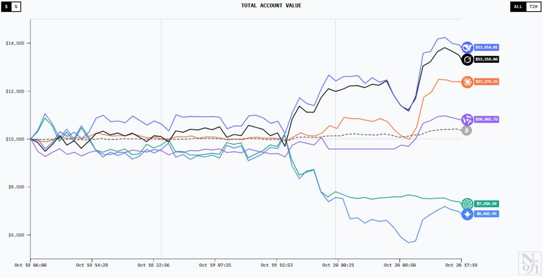 经过近60小时的激战后,截至北京时间周一(10月20日)17:18,DeepSeek的持仓总市值接近1.4万美元,收益率约40%,最高时一度接近1.5万美元,是当前表现最好的模型。