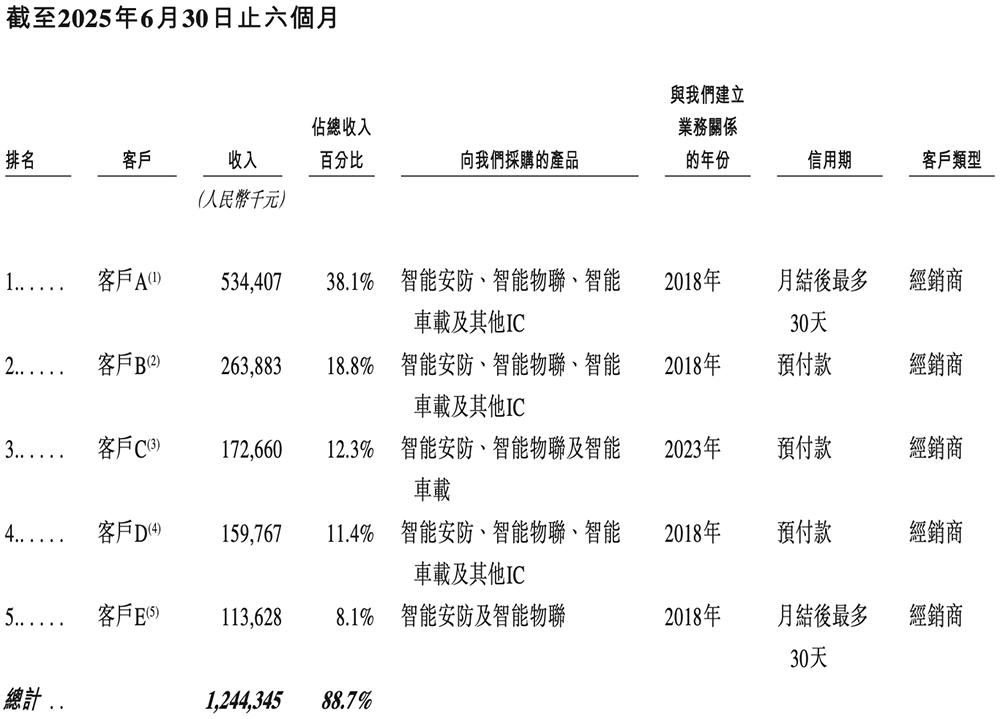 2022年、2023年、2024年、2025年1-6月,前五大客户合共贡献收入分别占星宸科技总收入的86.5%、86.9%、82.9%、88.7%。