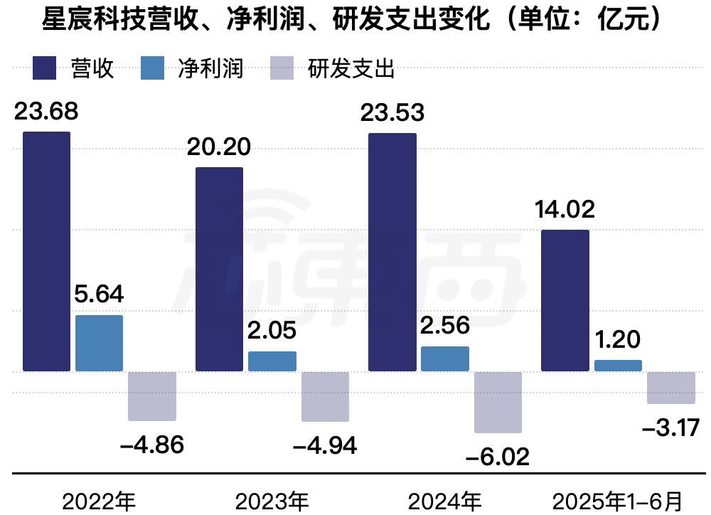 2022年、2023年、2024年、2025年1-6月,星宸科技收入分别为23.68亿元、20.20亿元、23.53亿元、14.02亿元,净利润分别为5.64亿元、2.05亿元、2.56亿元、1.20亿元,研发费用分别为4.86亿元、4.94亿元、6.02亿元、3.17亿元。