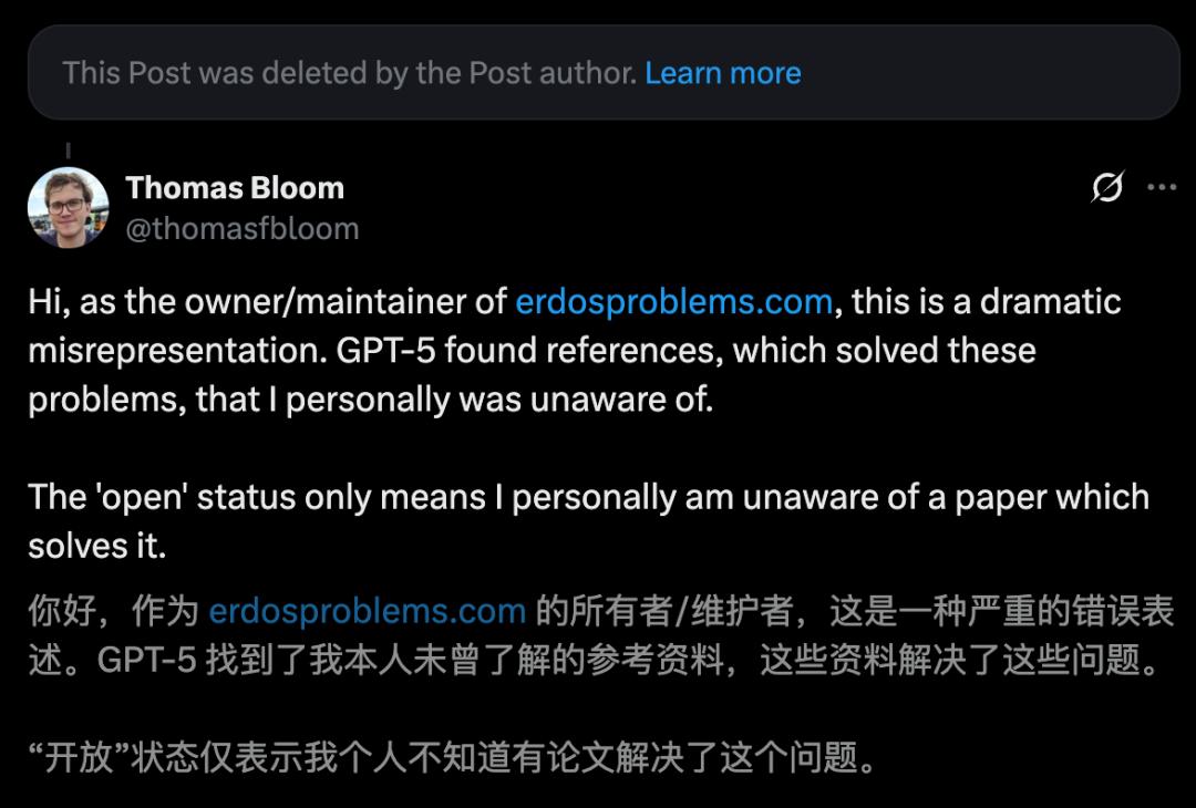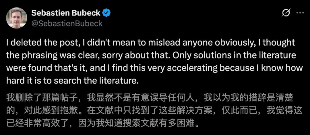 Sebastien Bubeck尴尬回复道,GPT-5只是在文献中找到了解决方案,仅此而已。