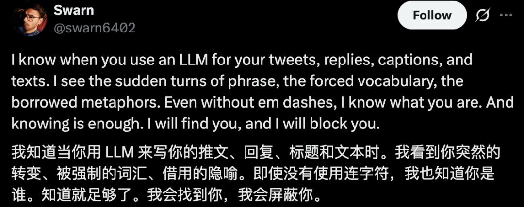 网友Swarn也提到经常会刷到疑似AI生成的推文,他会通过内容中夹杂的「突然转折、刻意堆砌的词汇、借用的隐喻」来识别「AI味」。