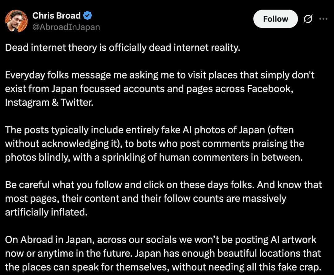 旅行类大V Chris Broad在X平台上表示,「死亡互联网理论」现在已经成为「死亡互联网现实」: