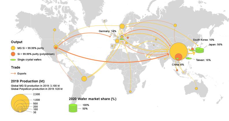 图 6:2019年金属硅和多晶硅产量以及2020年晶圆制造市场份额(BRGM)