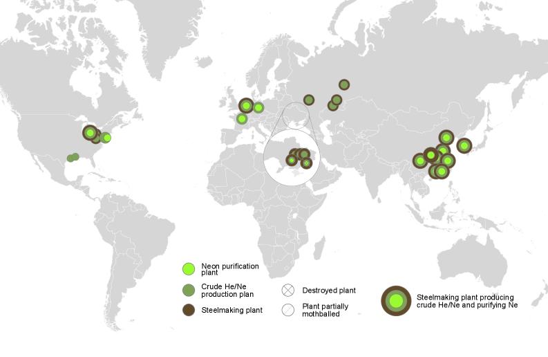 图 7:与粗氦/氖生产厂和炼钢厂相关的氖净化厂的非详尽地图