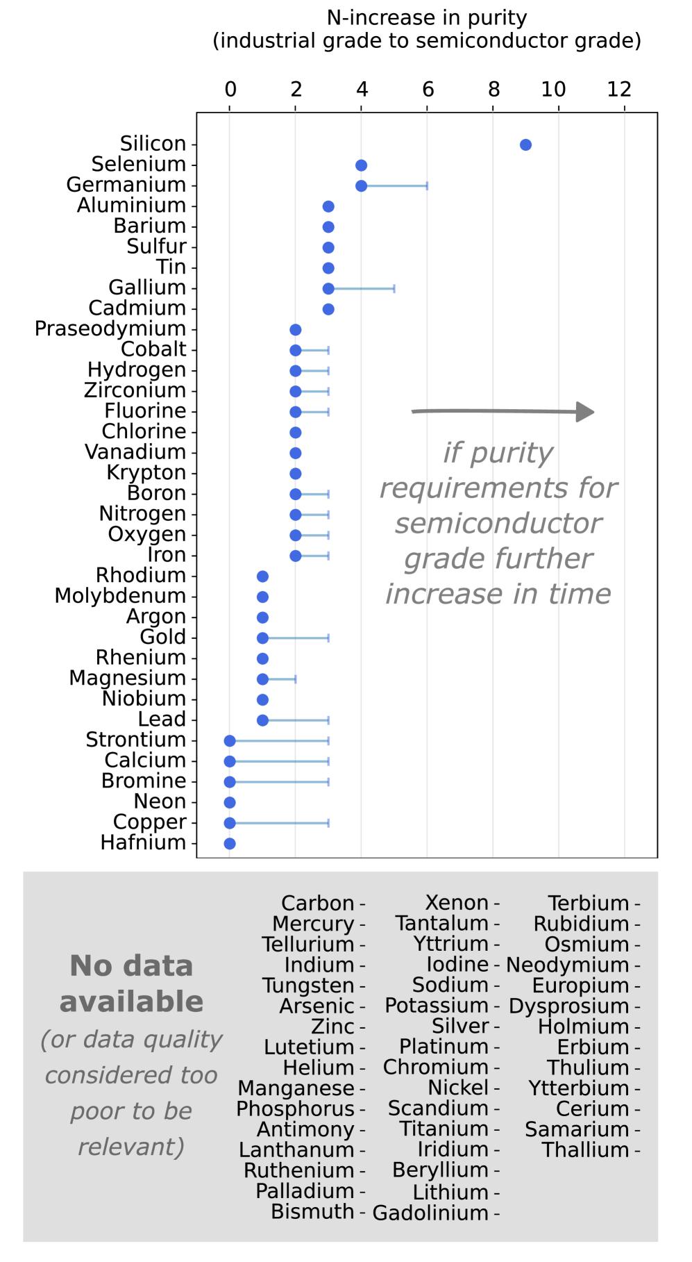图5:选定元素的标准级与电子/半导体级之间的比较。浅蓝色条表示计算中的差异,其中最高半导体级或最高非半导体级纯度在文献中未明确说明
