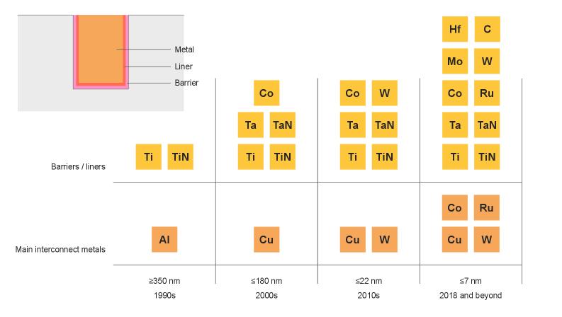 随着技术节点的缩小,不仅晶体管(FEOL:前端工艺)需要具有最高纯度的新(和旧)材料;互连堆叠(BEOL:后端工艺)也变得越来越特殊(在材料使用方面)和复杂。每一代都需要新的合金,以便在更小的技术节点中实现具有更低电阻率的互连。21 世纪初,铜互连只有 3-4 层,而现在,最新的 Nvidia 或 Apple 微芯片中的金属互连已超过 20 层,布线长度达数千公里。图2展示了现代CMOS技术节点中常见的BEOL金属堆叠的基本元素分解,并展示了这一演进过程的复杂性。任何关于最先进节点的信息,无论是在产阶段(例如2纳米)还是在研究阶段(例如0.8纳米),都是高度保密的,并且肯定会在这个图中增加更多元素。