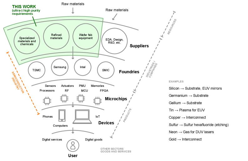 因此,本文旨在探讨纯度考量如何重塑和提升当前对数字产品和服务物质性的理解。我们探讨如何通过纯度视角审视微芯片的生产,揭示其二次物质化和瓶颈,这不仅关乎环境影响,也关乎行业供应链。为此,我们提出了一种互补方法,该方法依赖于微芯片行业特有的材料特性,该行业对材料的需求在两个方面极为特殊:(i) 多样性,即所含元素的数量;(ii) (超高)纯度要求。这适用于半导体制造工艺中涉及的许多材料,包括金属,也包括气体,无论它们是在减材制造工艺中使用还是永久存在于晶圆上(最终存在于最终产品中)。我们展示了这两个特性如何成为一种更精细方法的关键,从而能够识别和单独分析半导体行业上游的物质性。