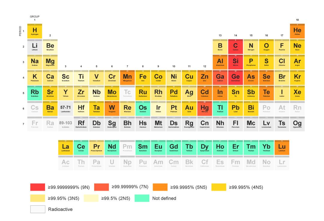 图4汇总了我们对现代微芯片制造纯度要求的最佳推测。虽然无法检索元素周期表所有元素的数据,但该列表涵盖了大多数非放射性元素。显然,半导体制造的纯度要求取决于元素本身,例如,Si 的要求可能高于 11N (99.999999999%) ,而 Au 的要求仅限于 4-5N 。图4中报告的纯度水平考虑了常用的半导体级纯度水平。