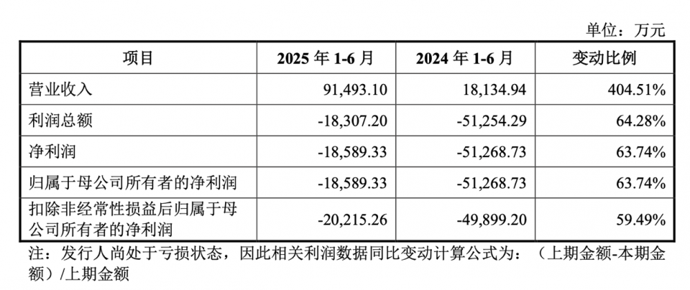 在最新的申报稿当中,沐曦股份披露了最新2025年上半年的财务数据:营收为9.15亿元,同比暴涨404.51%;净利润为-1.86亿元,同比减亏63.74%。
