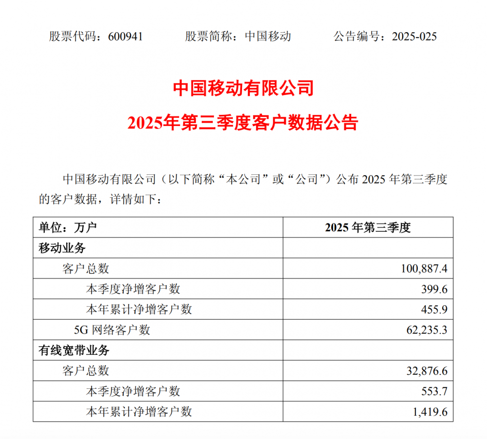 C114讯 10月21日消息(九九)中国移动昨日发布2025年第三季度客户数据公告,截至9月30日,中国移动移动业务客户总数达10.08874亿户,本年累计净增455.9万户。其中5G网络客户数达6.22353亿户。