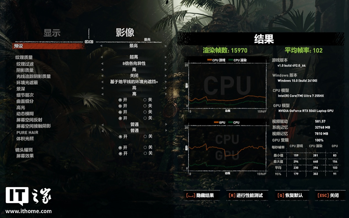 在经典光栅游戏《古墓丽影:暗影》中,在 1600P + 最高画质设置下,运行游戏自带基准测试:
