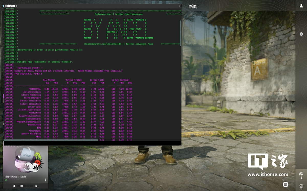 首先是在线竞技游戏《CS2》,以 1600P 分辨率 + 高画质,运行创意工坊 FPS Benchmark 地图进行测试:
