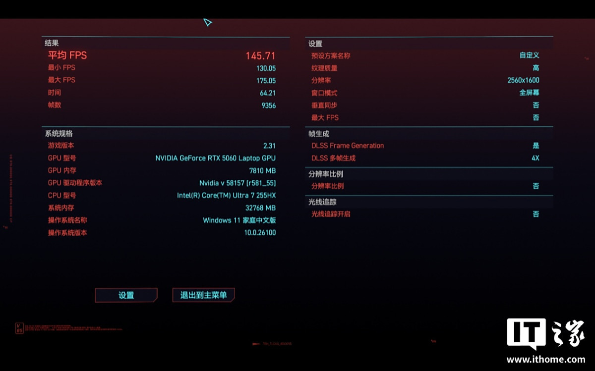 在超级画质 + 4x 帧生成下,游戏平均帧数为 145 帧,1% Low 帧为 118 帧。