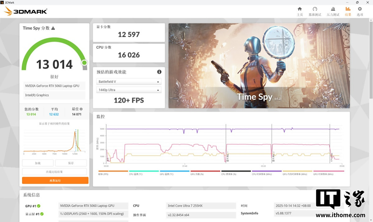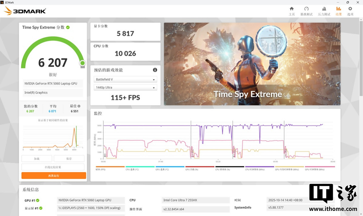 GPU 方面,在 3D Mark Time Spy 基准测试中,115W 功耗的 RTX 5060 跑出了 12597 分的成绩。在 3D Mark Time Spy Extreme 基准测试中,RTX 5060 跑出了 5817 分的成绩。