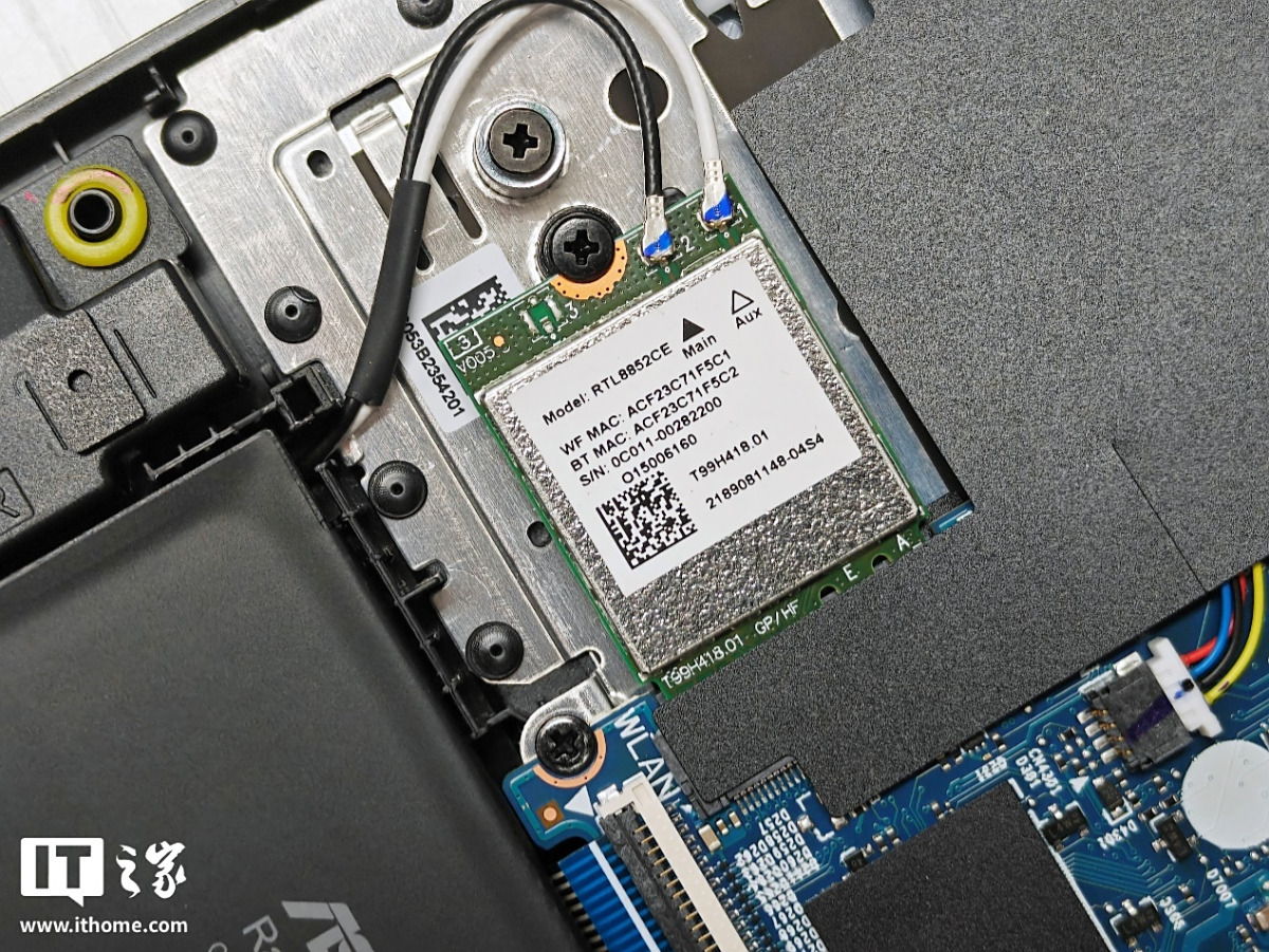 左侧固态插槽下方是 1 张 Wi-Fi 6E 无线网卡,型号为瑞昱 RTL8852CE,理论最高传输速率可达 5.3Gbps 左右,同时支持蓝牙 5.3 技术。