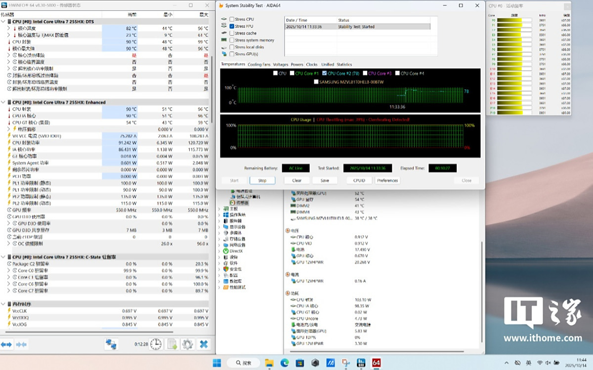 看完续航,是时候看下它的功耗和散热表现了。直接上烤机,单烤 CPU,10 分钟后 CPU 温度稳定在 90℃,CPU 功耗可以保持在 100W 左右,此时的 CPU 性能核频率为 3.7-3.8GHz,能效核频率为 3.5-3.6GHz。