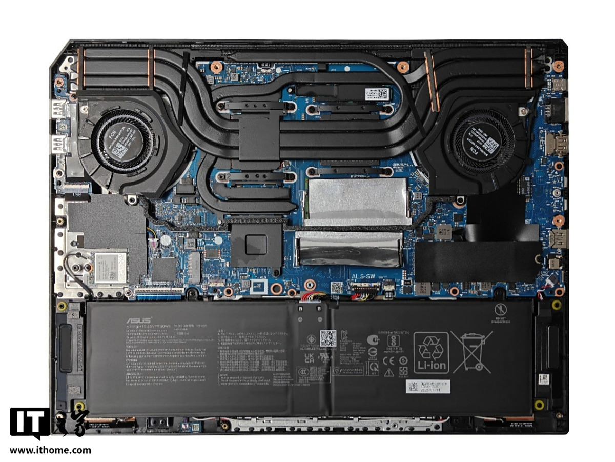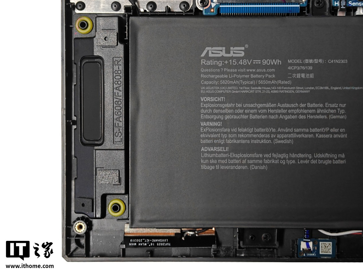 最下方是一块 90Wh 容量的电池,支持 100W PD 快充。我们都知道英特尔酷睿 Ultra 7 处理器通过优化能效架构设计,在相同性能输出下,相比前代产品能耗降低了约 20%,因此华硕天选 6 Pro 酷睿版的续航表现非常令人期待,我们也通过多轮测试来验证下它的实际续航表现。