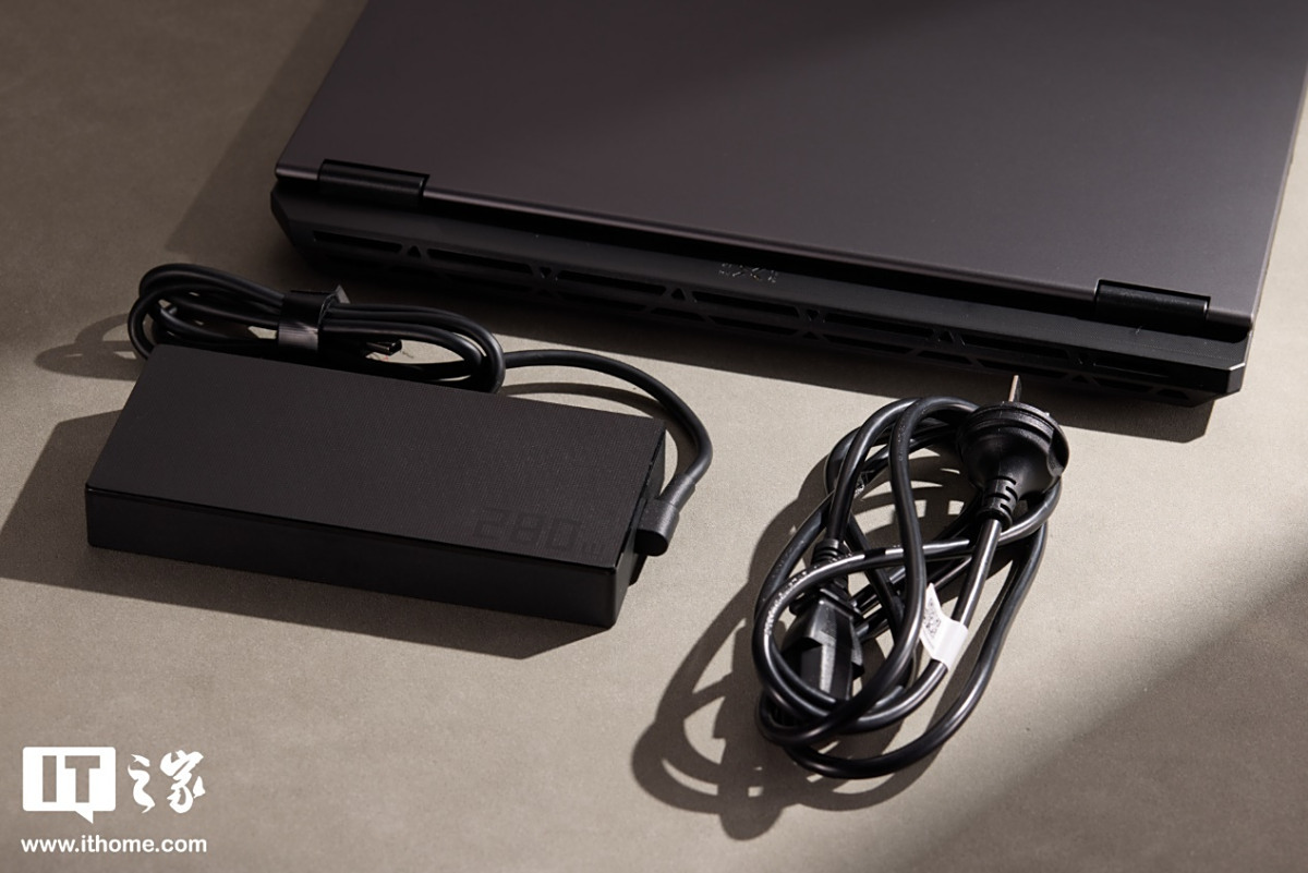 配件方面,华硕天选 6 Pro 酷睿版标配定制方形接口的 280W 黑色电源适配器,采用分离式可拆卸设计和三脚插头。