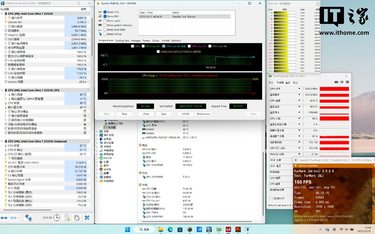 再来是双烤,10 分钟烤机后,CPU 功耗维持在 55W 水平,CPU 温度相比单烤时下降了一些,来到 84℃;CPU 频率稳定在 3.3GHz。GPU 方面仍保持在 115W 的满功耗,GPU 主频降到了 2332MHz,GPU 温度提升至 80.4℃,显存温度为 66℃。