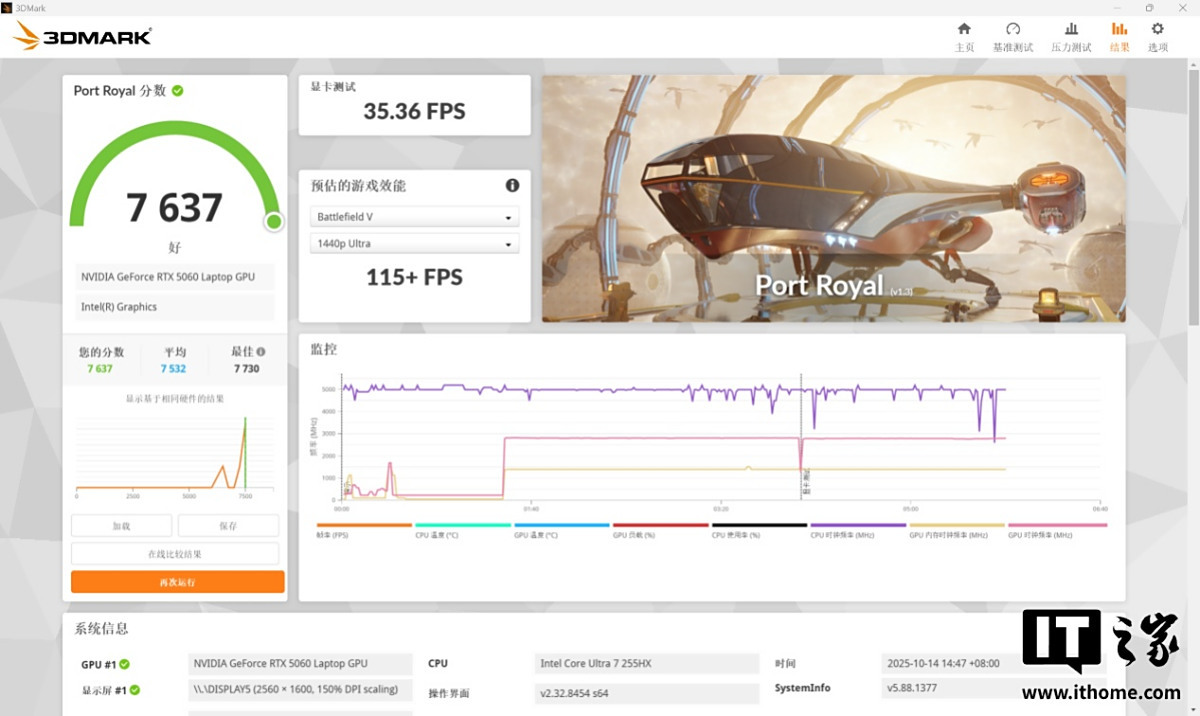 在考验光追性能的 Port Royal 测试中,RTX 5060 跑出了 7637 分的成绩。总体而言,RTX 5060 属于稳定发挥,符合其应有的表现。