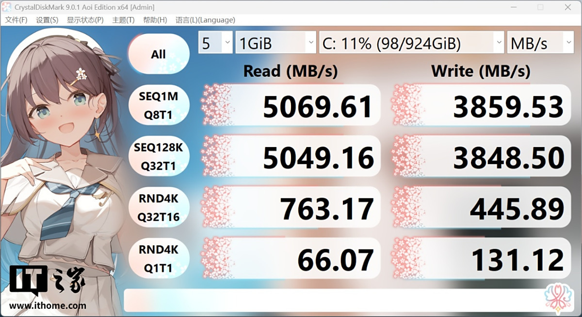 电池上方左右两侧分别放置了 1 个 M.2 硬盘插槽,右侧自带的原装 1TB 容量固态硬盘来自三星,具体读写性能表现如图所示,其顺序读取速度 5000MB/s 左右,顺序写入速度 3800MB/s 左右。