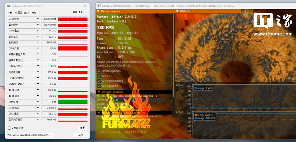 然后是单烤 GPU,10 分钟烤机后 GPU 功耗维持在 115W 水平,GPU 温度 74℃,显存温度 62℃,GPU 主频稳定在 2782MHz 左右。