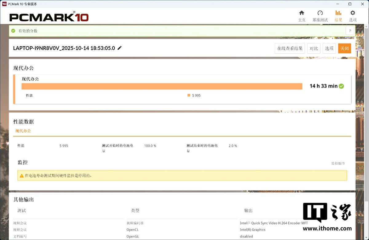 第三轮测试,我们使用 PC Mark 10 的现代办公续航基准测试将笔记本从满电测到关机,最终续航成绩达到了 14 小时 33 分。