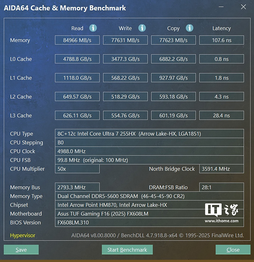 自带的 2 个内存插槽被热管和右风扇环绕其内,其中上方内存插槽自带 1 条 16GB DDR5 5600MHz 内存,到手后我们又加装了 1 条相同规格的内存条组成双通道。实测读取速度可达 84966MB/s,写入和拷贝速度均在 77000MB/s 以上,内存延迟 107.6ns,稍好于采用 AMD 平台和板载内存的笔记本表现。