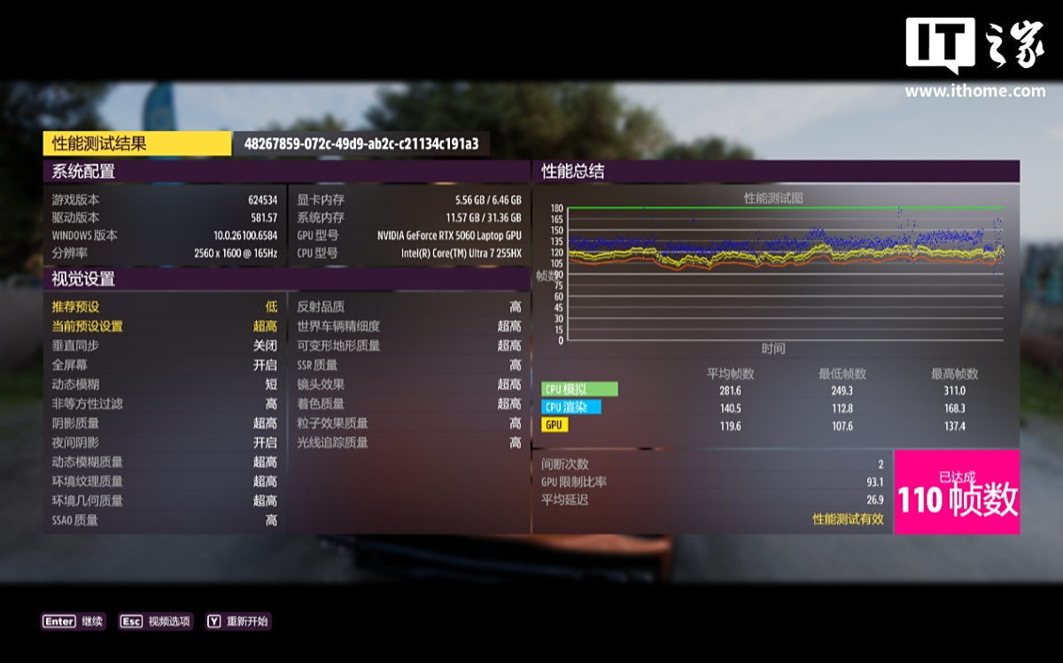 《极限竞速:地平线 5》这款游戏对显存的要求很高,在 1600P + 超高画质下,运行游戏自带基准测试: