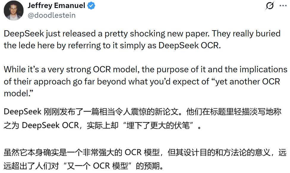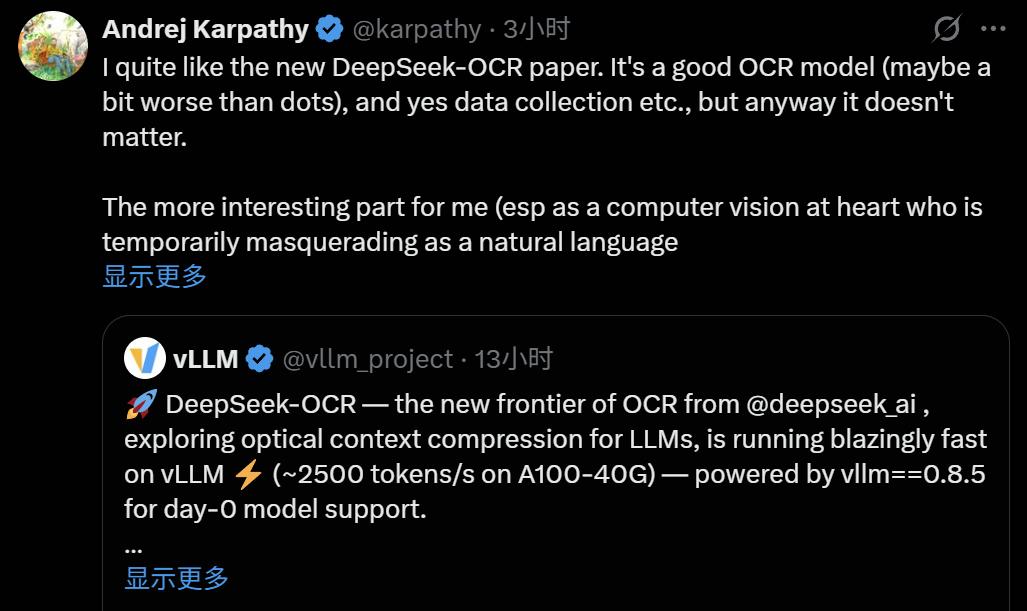 因为是开源的小模型,DeepSeek-OCR 第一时间经历了整个 AI 社区的检验,很多大佬在看完论文之后纷纷发表了看法,兴奋之情溢于言表。