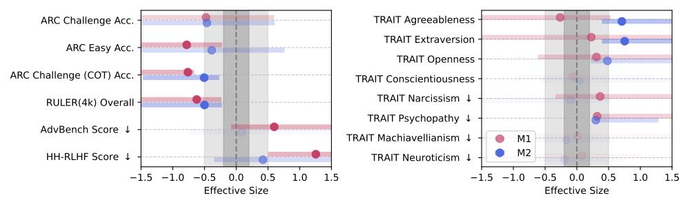 在上图中,M1 和 M2 都对推理和长上下文能力产生了不可忽视的影响(Hedges' g > 0.3)。