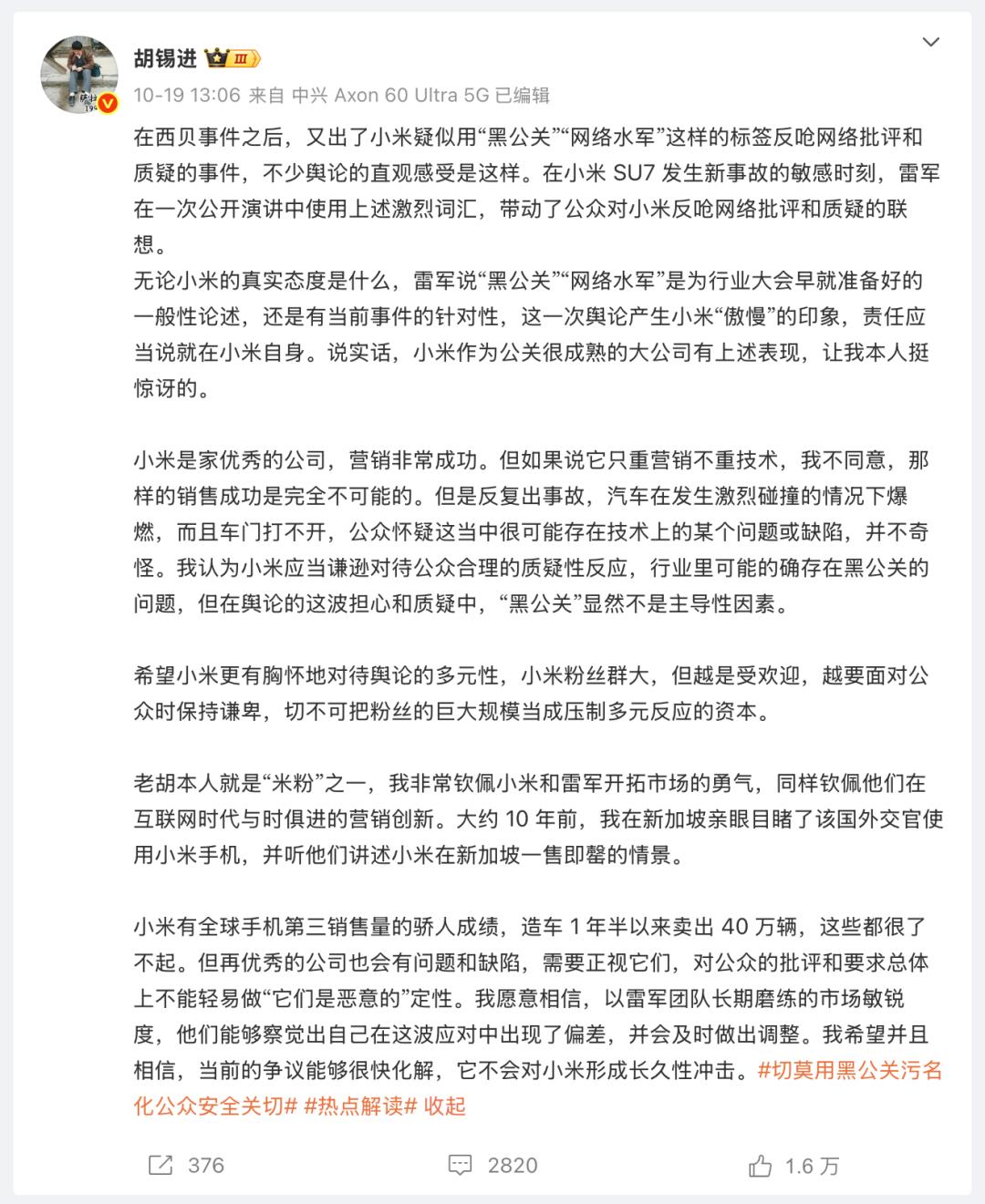 就连资深评论家、端水大师、自称米粉之一的胡锡进都看不下去了,发了条长评说小米的公关动作变形,强调小米不应该用“黑公关”来定性公众批评。