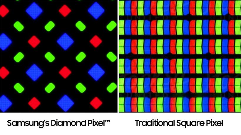 首先,最容易被用户感知到的“字体边缘更清晰”,其根本原因在于三星独家的“钻石排列” (Diamond Pixel) 专利技术。这种技术的特点是红蓝共用的 Pentile 布局下,绿色子像素最多并呈椭圆形,红蓝子像素为菱形(钻石状)且尺寸较大。