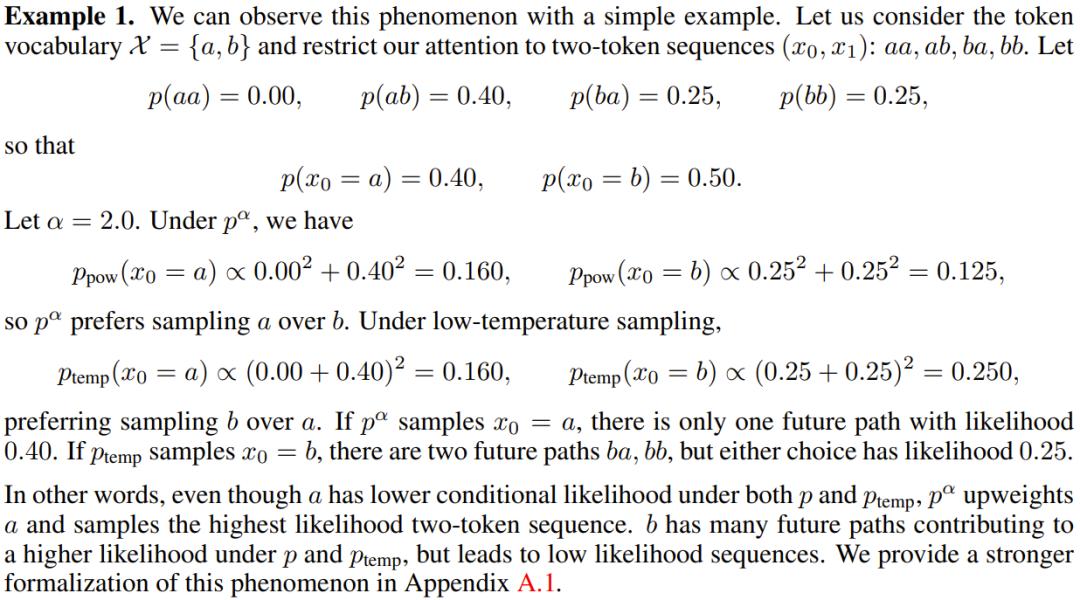 一种理解这种差异的直观方式是:低温采样没有考虑到幂运算如何锐化时间步 t 时的「未来路径」的似然度,而是「贪婪地」平均了所有这些未来的似然度。另一方面,从 p^α 采样则内在地考虑了未来的完成情况,因为它在计算下一 token 预测的权重之前,对所有未来路径进行了幂运算。