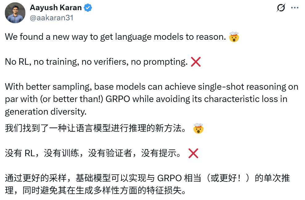 近日,哈佛大学一篇论文探索了能否不使用任何额外训练,通过纯粹的采样让基础模型表现出推理能力。