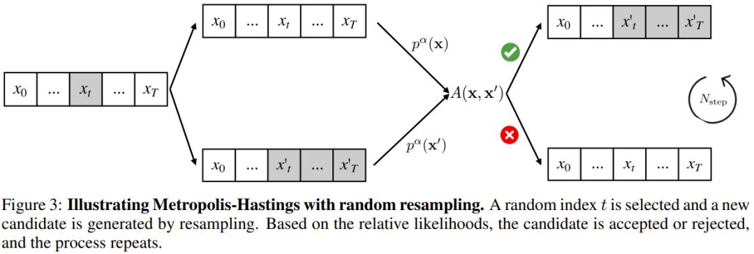 为了解决这个问题,他们采用了一种名为 Metropolis-Hastings (MH) 的马尔可夫链蒙特卡洛 (MCMC) 算法 [Metropolis et al., 1953],它恰好能实现这个目标:从一个未归一化的概率分布中进行近似采样。