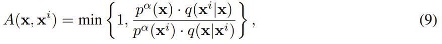 。候选样本 x 以如下概率被接受为 x^{i+1}: