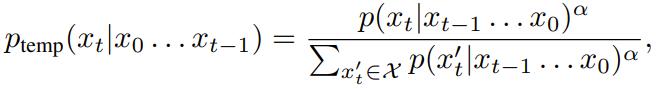 一个众所周知且相关的锐化策略是低温采样 (low-temperature sampling) ,即在每一步都对条件性下一 token 分布进行幂运算: