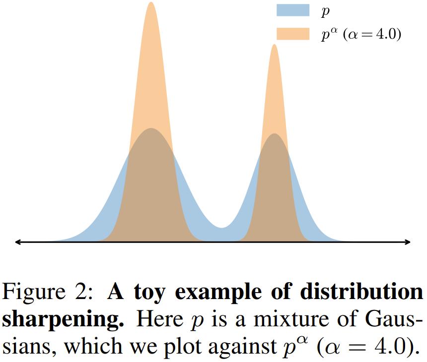 具体来说,针对一个参考分布(reference distribution),锐化是指对该分布进行重新加权,使得高似然度区域的权重被进一步提升,而低似然度区域的权重被降低,从而使采样大幅偏向于参考分布下的高似然度样本。