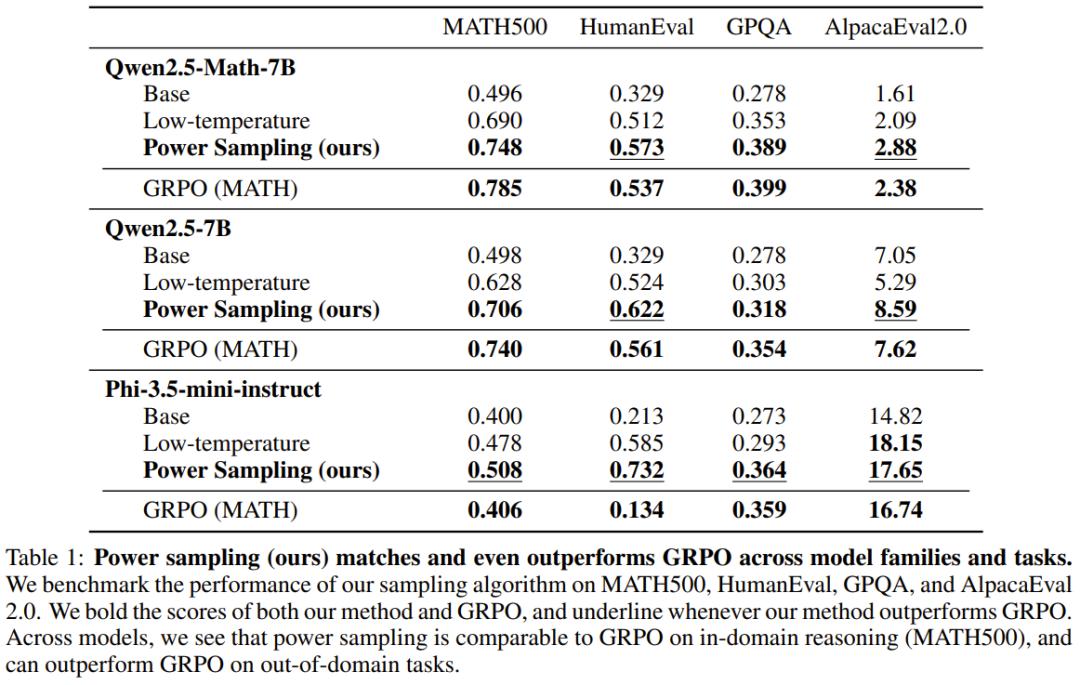 特别要指出,在 MATH500 这个 RL 后训练的领域内任务上,幂采样实现的准确度与 GRPO 获得的准确度相当。
